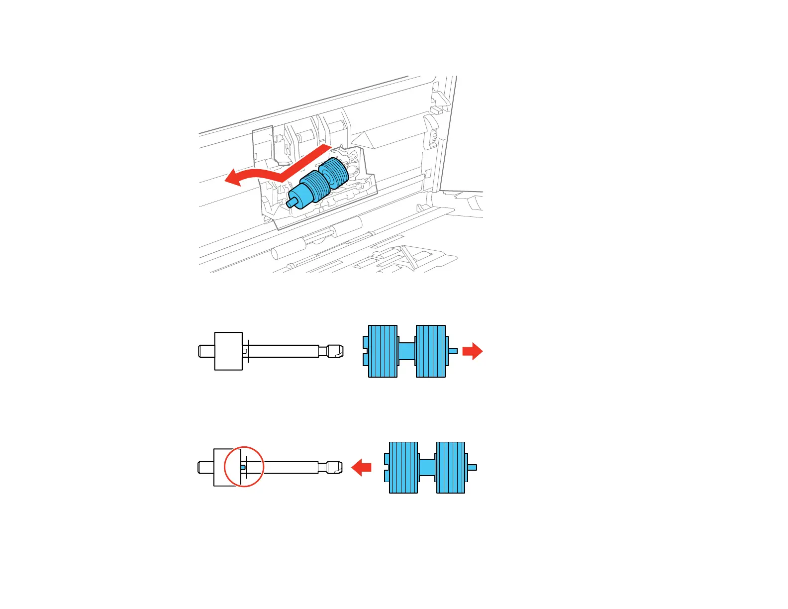 5. Press in on the separation roller to release it, then slide the roller to the side and remove it.