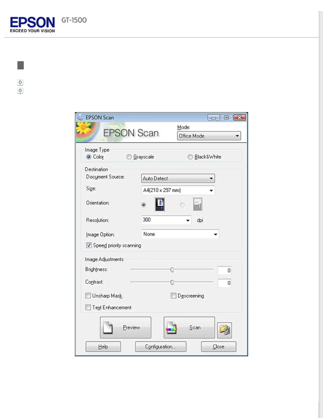 When you start Epson Scan for the first time, it runs in Office Mode and displays the Epson Scan Office Mode window.