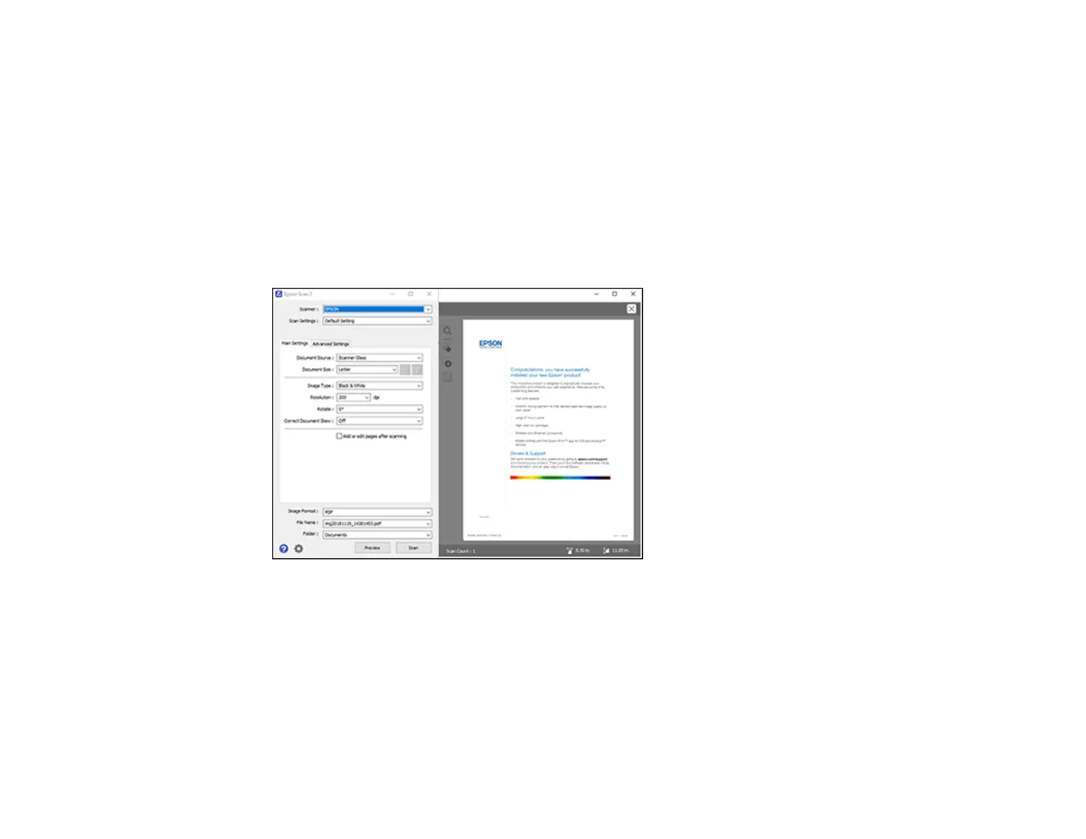 Epson Scan 2 previews your original and displays the results in the Epson Scan 2 window.