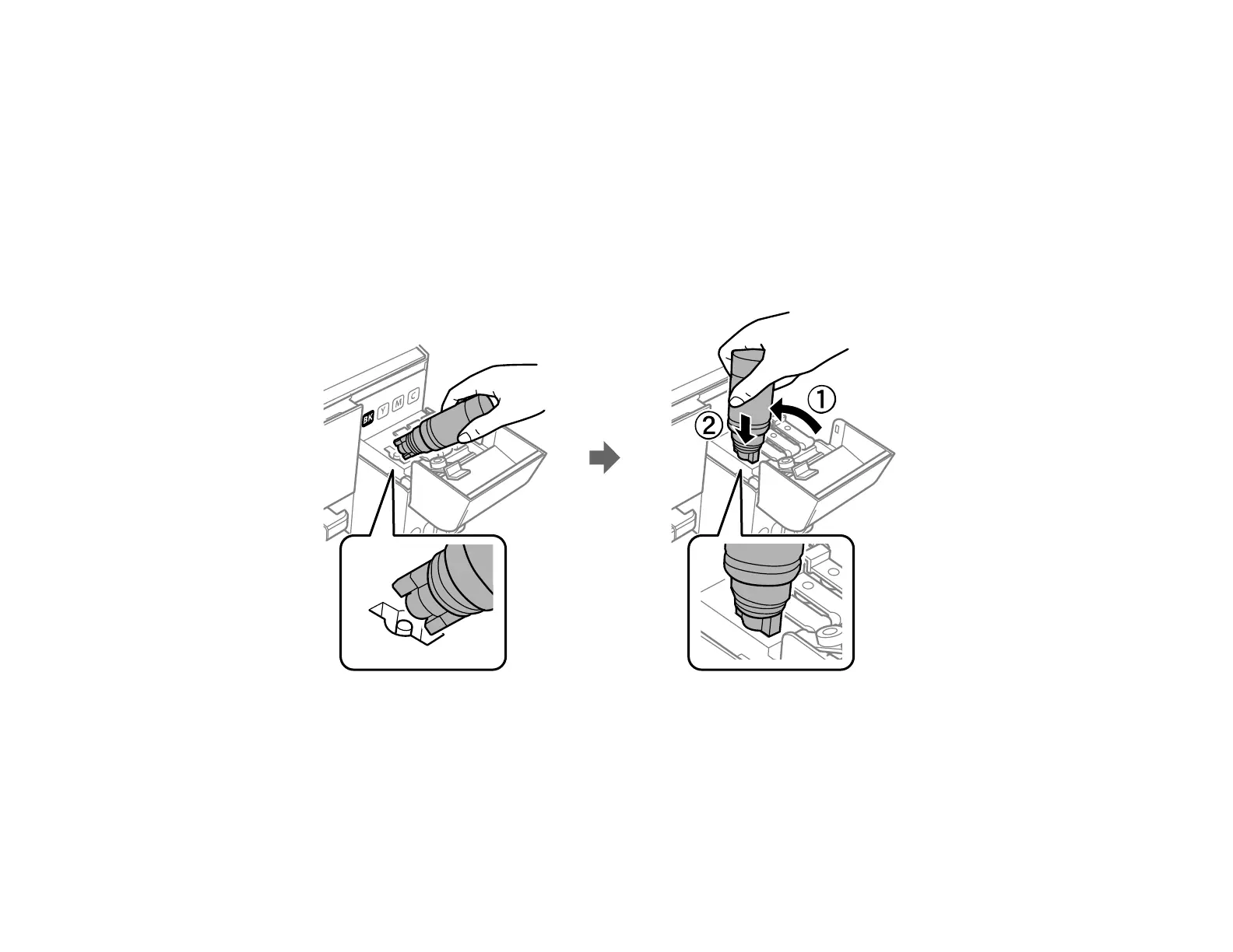 7. Position the top of the ink bottle along the slot in front of the filling port, then slowly stand the bottle