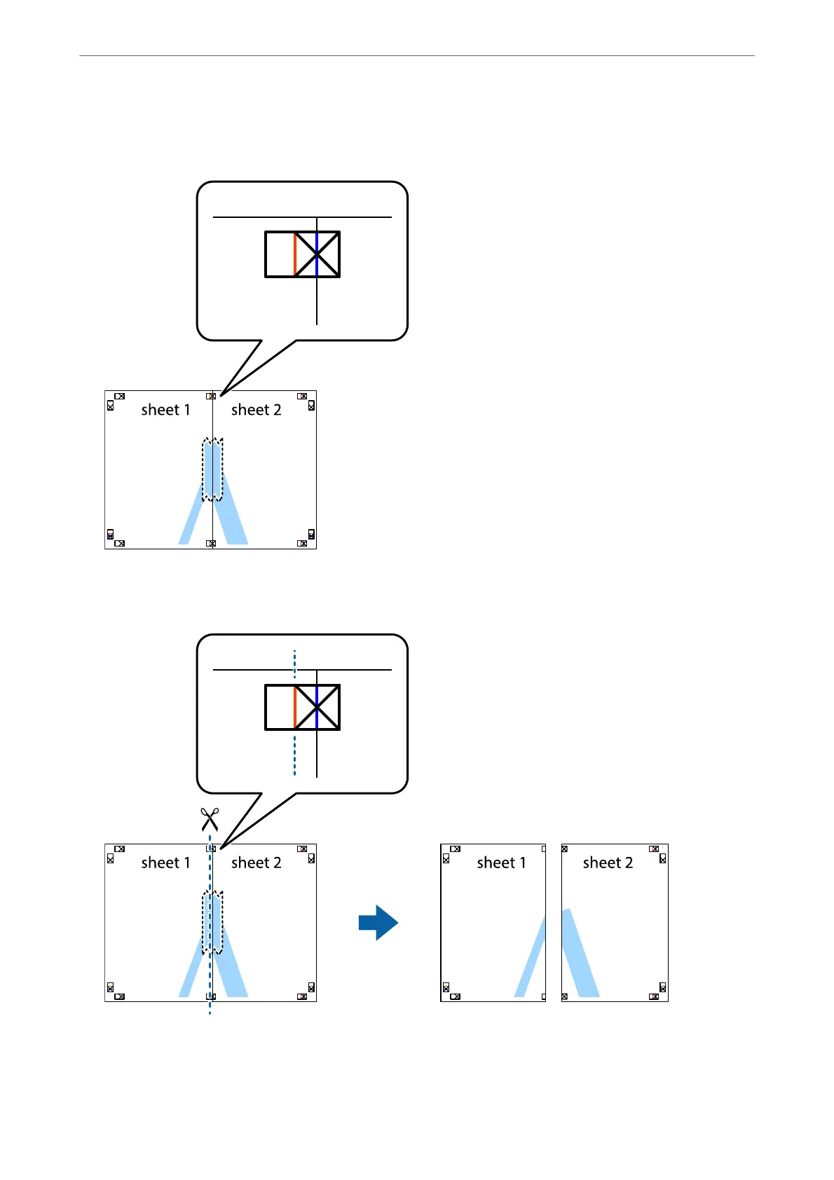 Place the edge of Sheet 1 on top of Sheet 2 and align the cross marks, then temporarily tape the two sheets