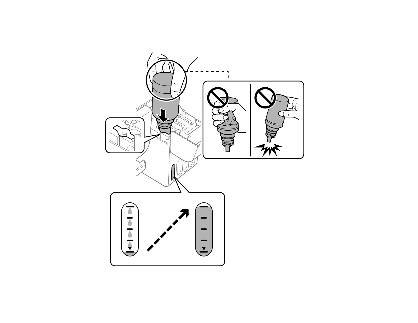 up to insert it. Wait for the ink to fill the tank. Do not squeeze the bottle. Ink flows into the tank and