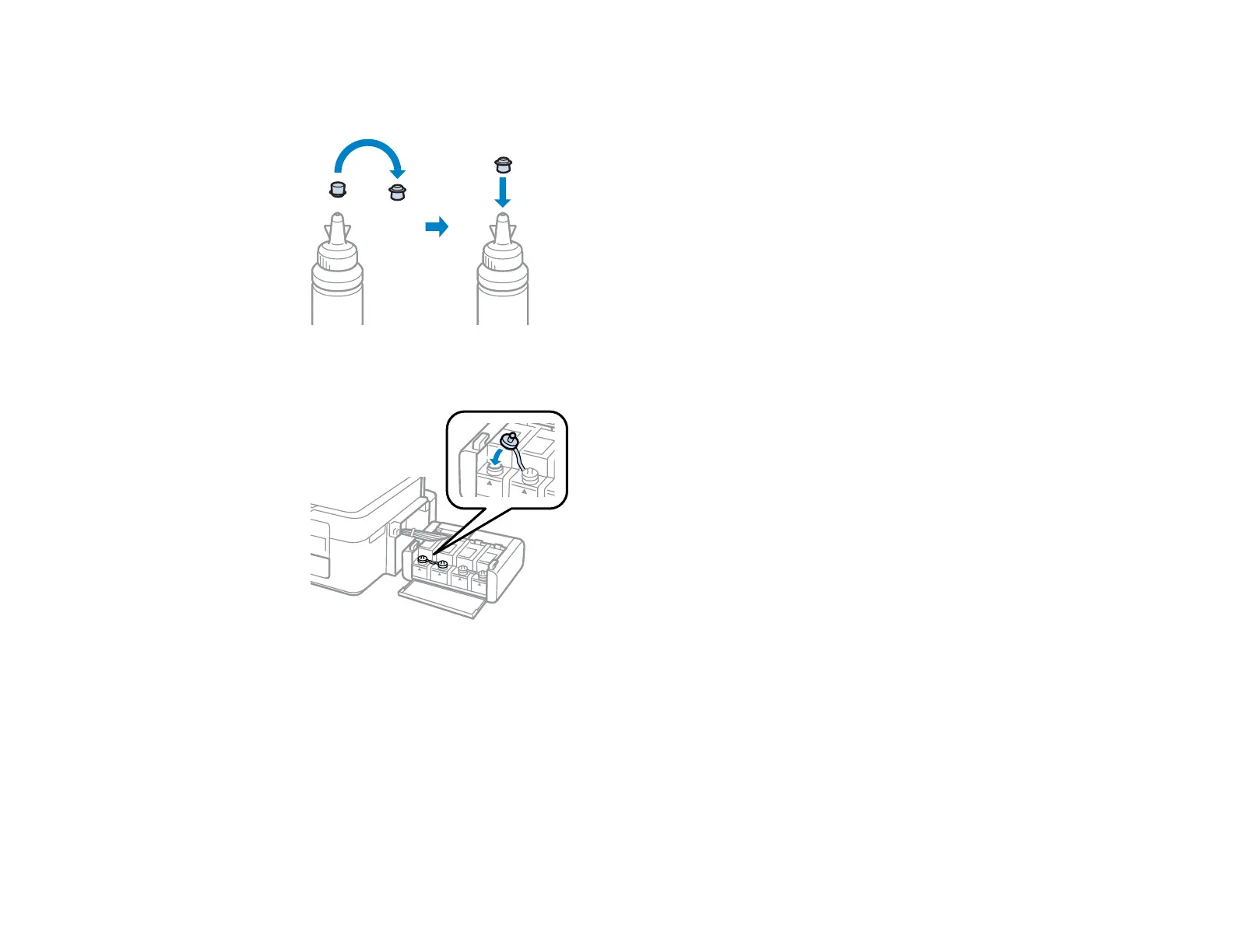 8. If any ink remains in the ink bottle after filling the ink tank, place the bottle cap tip securely on the