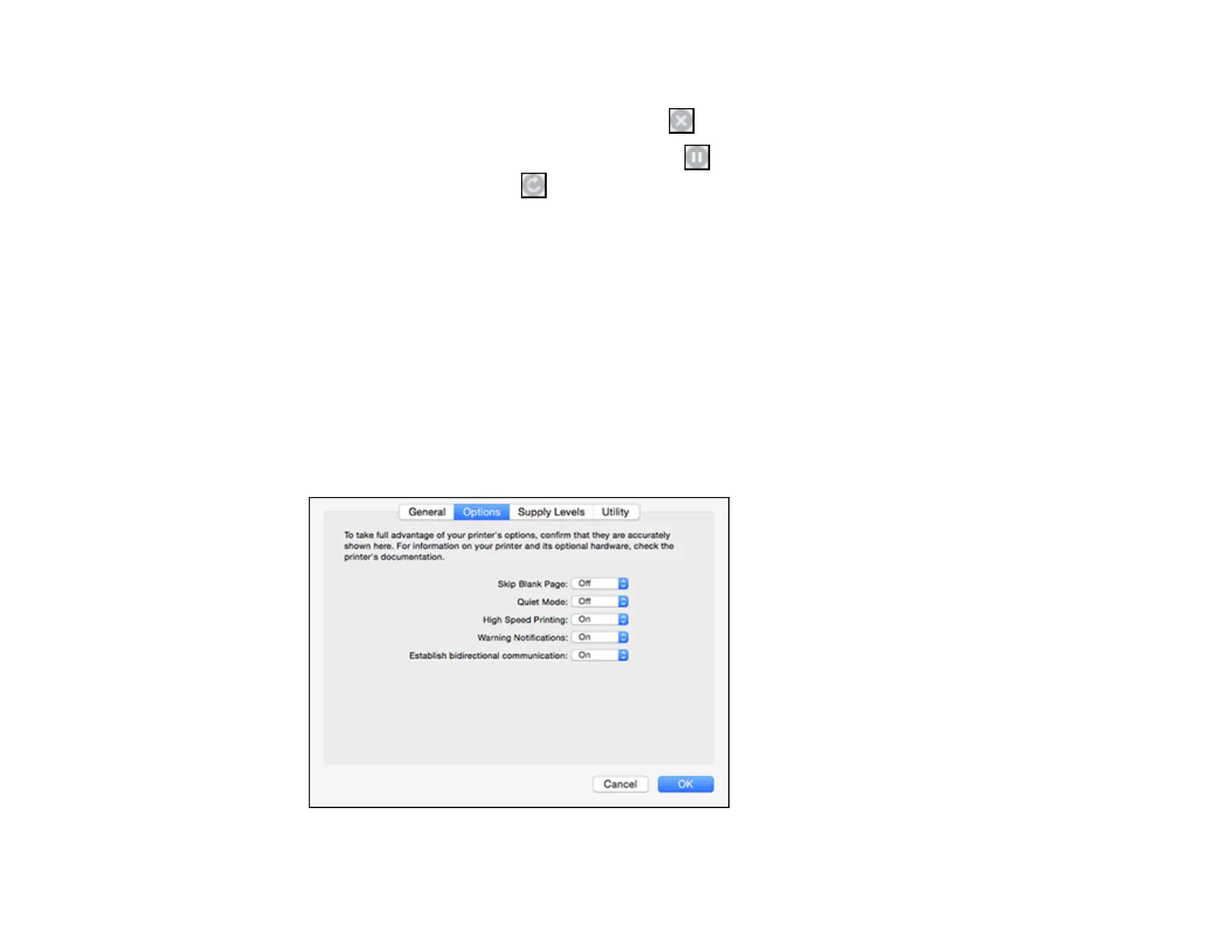 • To pause printing for all queued print jobs, click Pause or Pause Printer.