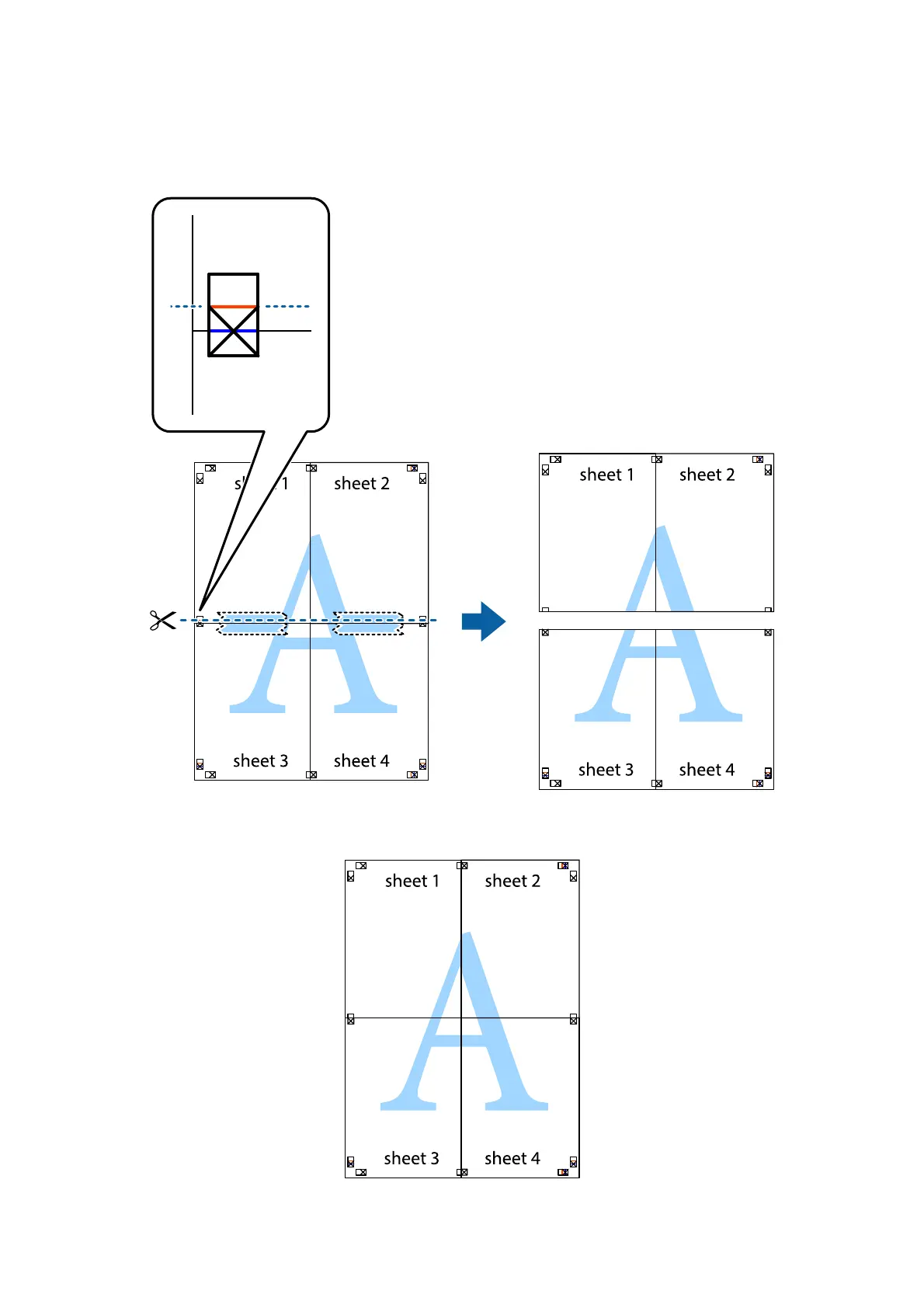 8. Cut the taped sheets in two along the horizontal red line through the alignment markers (this time, the line