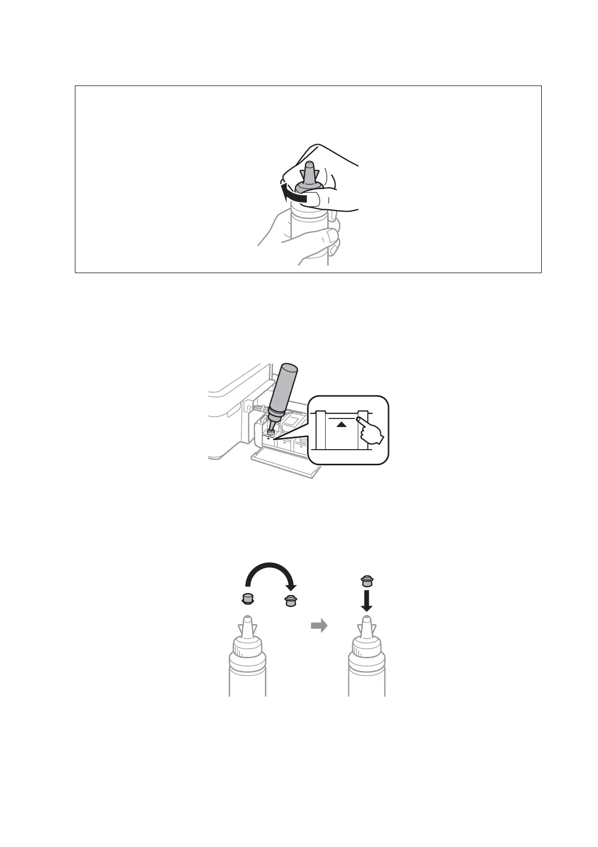 If any ink remains in the ink bottle aer lling the ink tank up to the upper line, install the top of the cap securely and