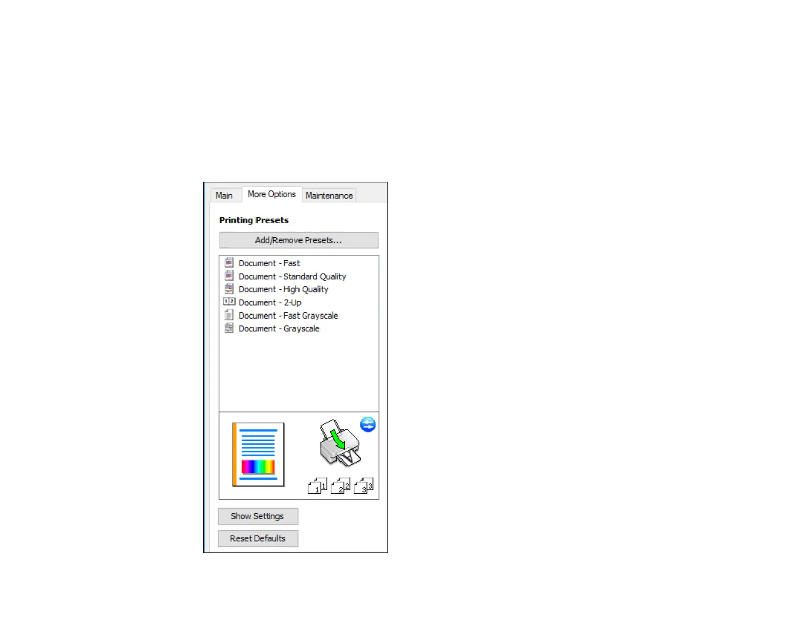 For quick access to common groups of print settings, you can select a printing preset on the Main or