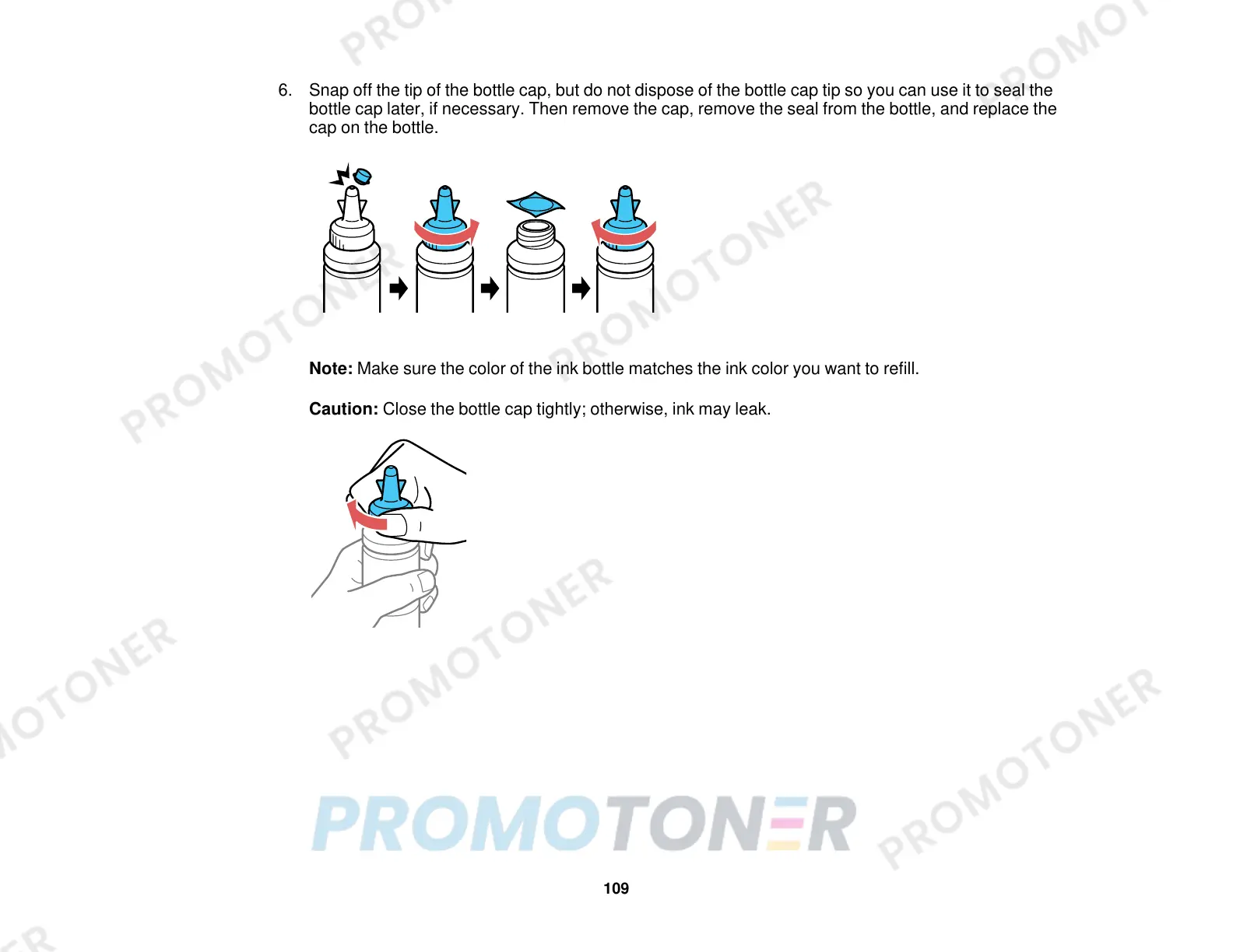 Caution: Close the bottle cap tightly; otherwise, ink may leak.