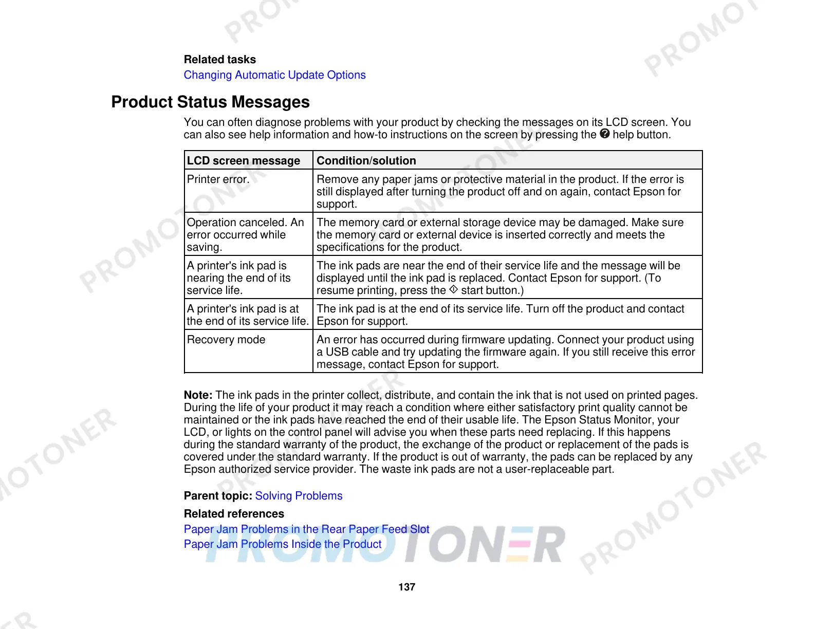 nearing the end of its displayed until the ink pad is replaced. Contact Epson for support. (To