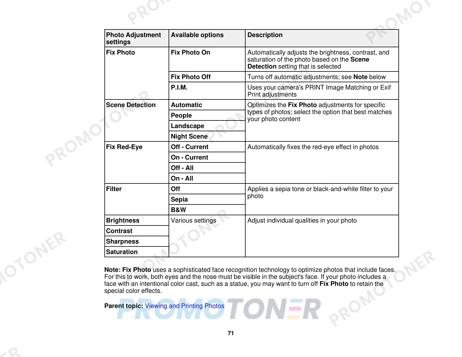 Fix Photo Off Turns off automatic adjustments; see Note below
