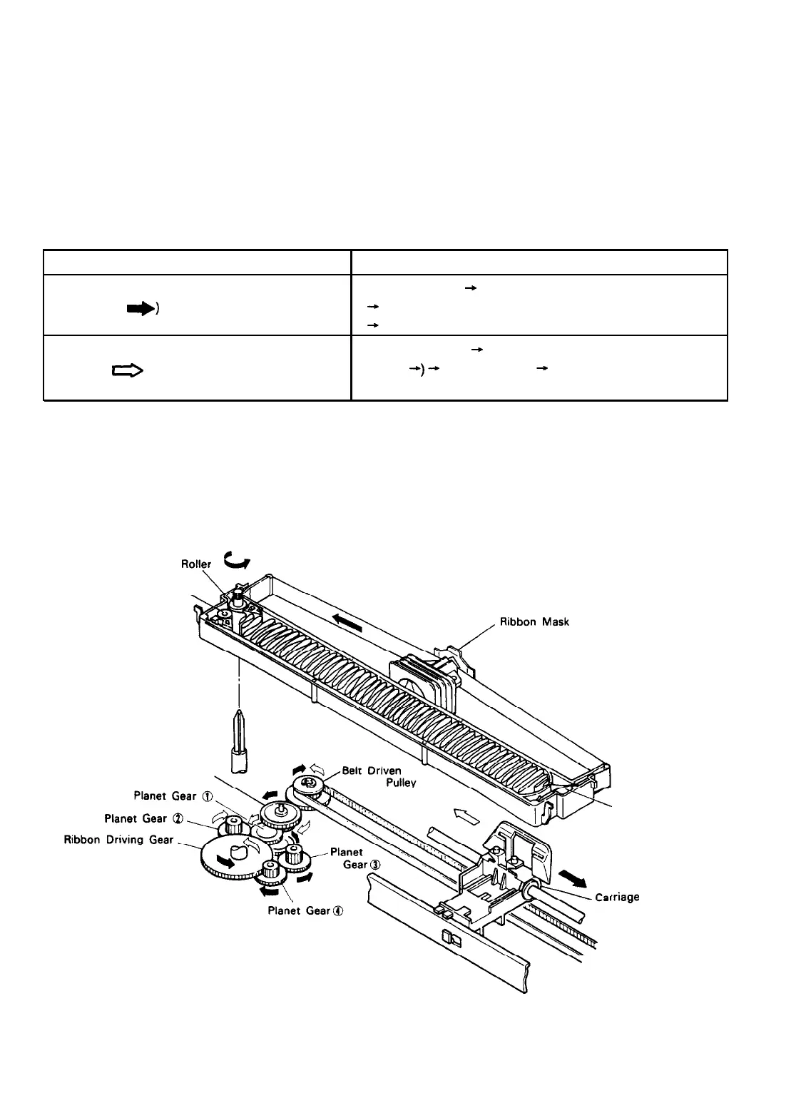 The ribbon-feed mechanism consists of the ribbon cartridge and the ribbon-feed section. The ribbon-driving