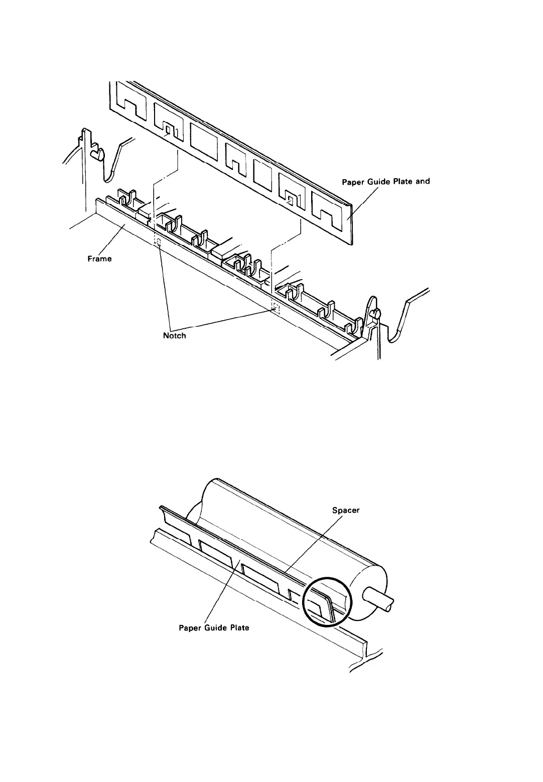 Loosen the two tabs securing the paper guide plate and spacer to the frame, and lift and remove the plate.