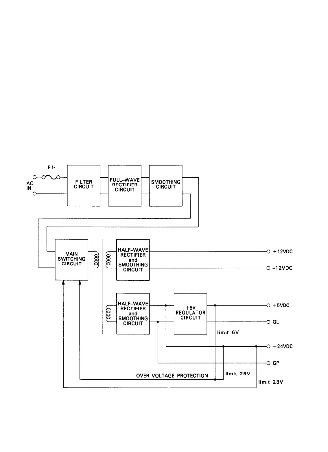 type switching regulator circuit, and outputs + 5, + 24, and + 12 VDC.