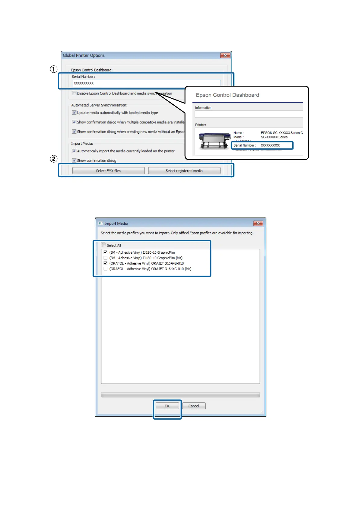 This displays a list of the print information from the EMX files you selected in step 5. Select the necessary items.
