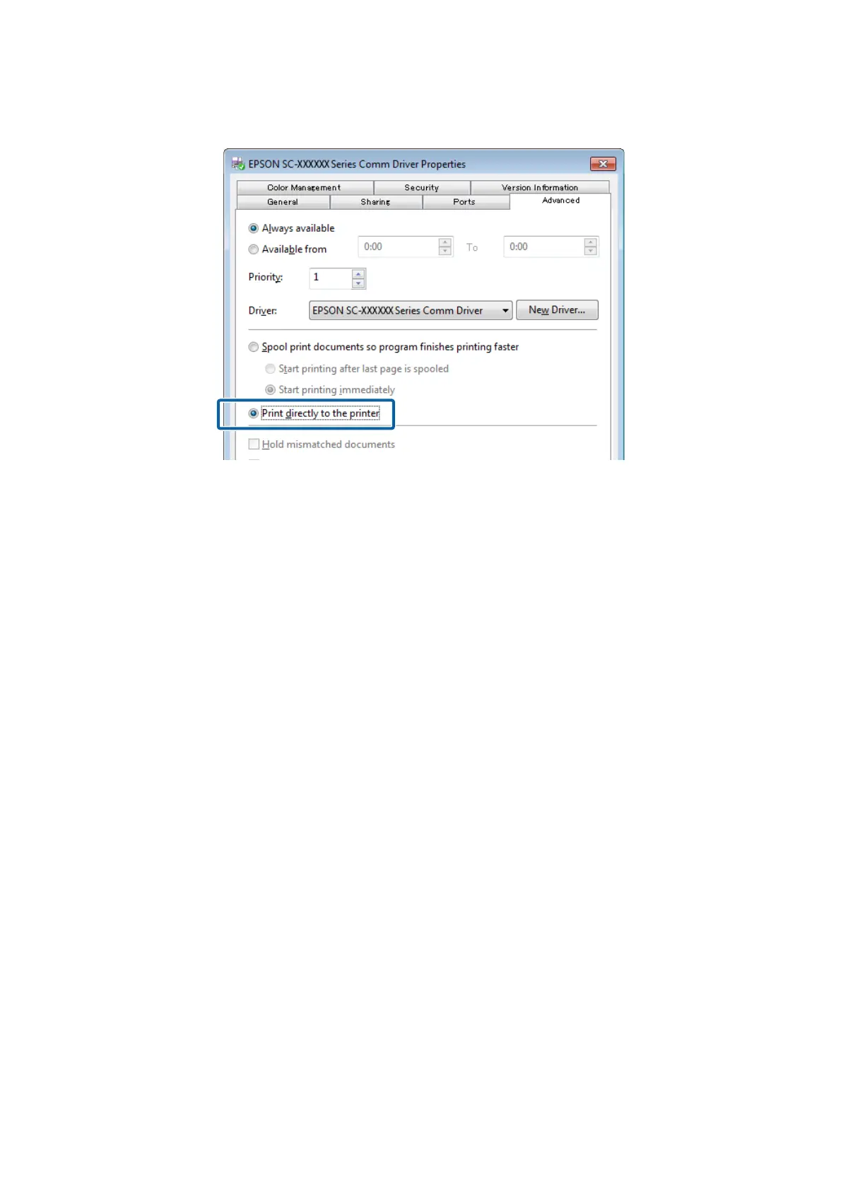 In the Advanced tab, select the spooling method Print directly to the printer.