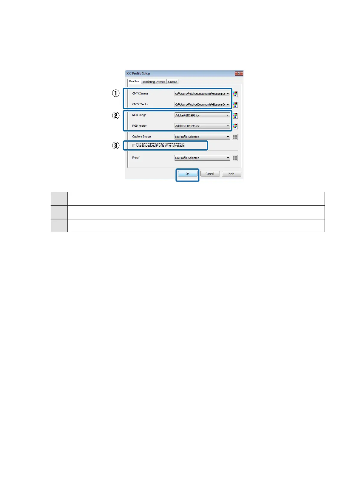 Change (1) through (3) in the Profiles tab to match the settings of the image processing software, and then click