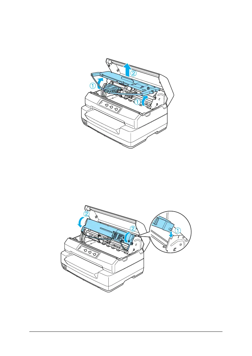 9. Place the plastic hooks on the ribbon cartridge into the slots