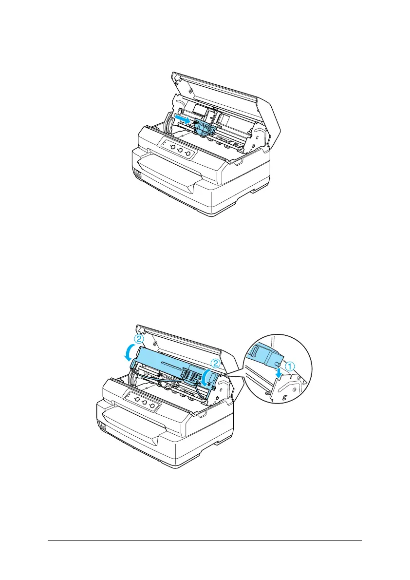 6. Place the plastic hooks on the ribbon cartridge into the slots