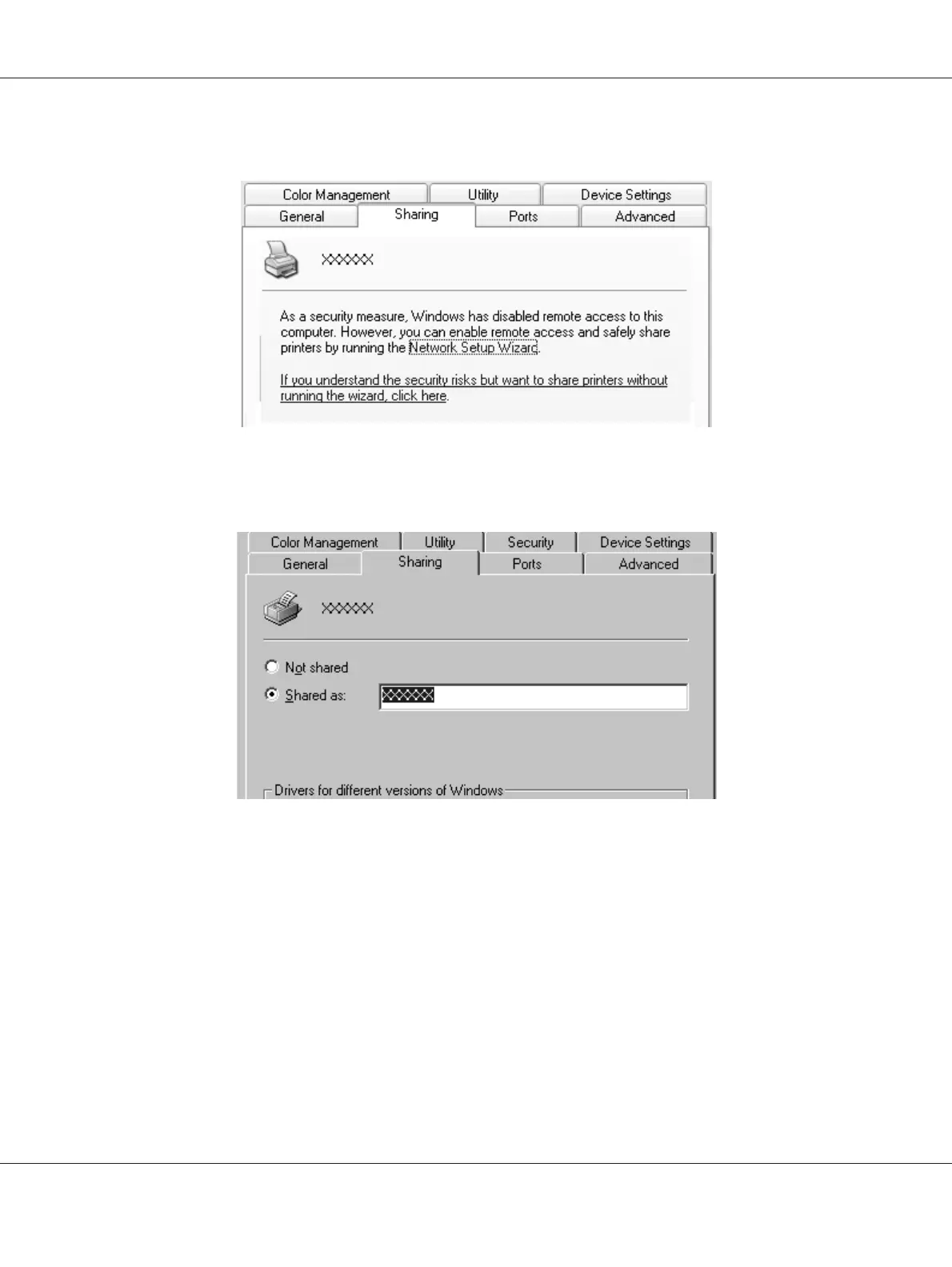 3. For a Windows 2000 printer server, select Shared as, then type the name in the Share name box