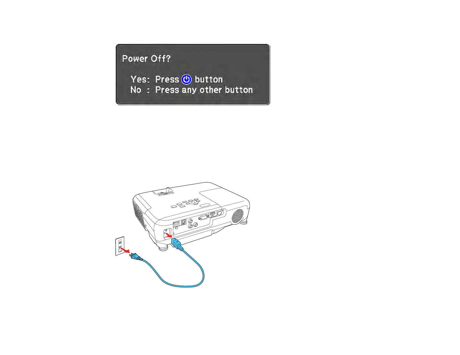 The projector displays a shutdown confirmation screen.