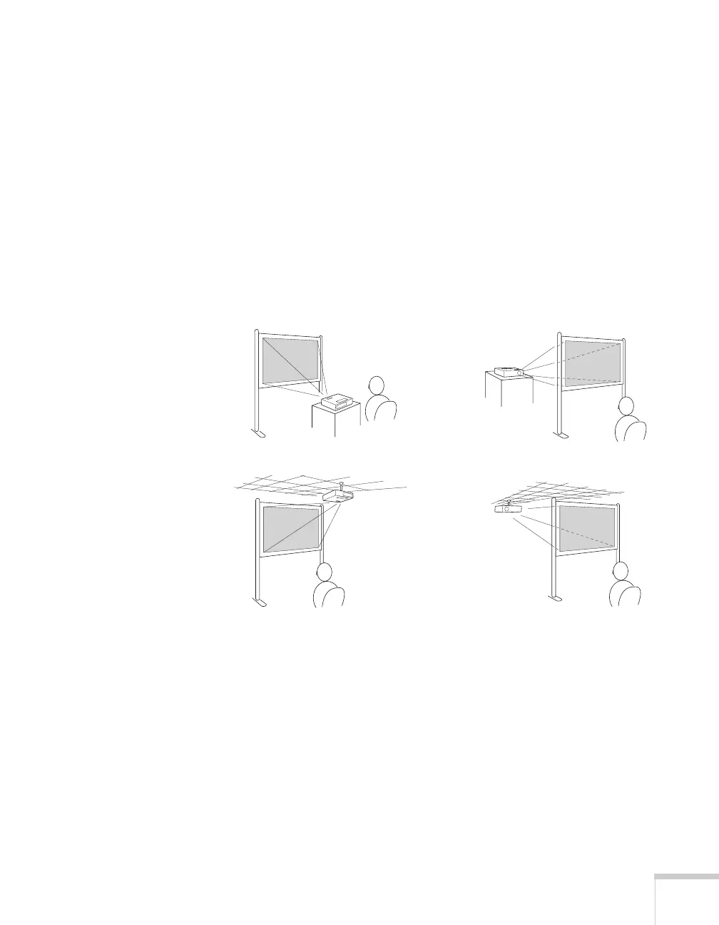 The projector can be installed for four different viewing setups: front