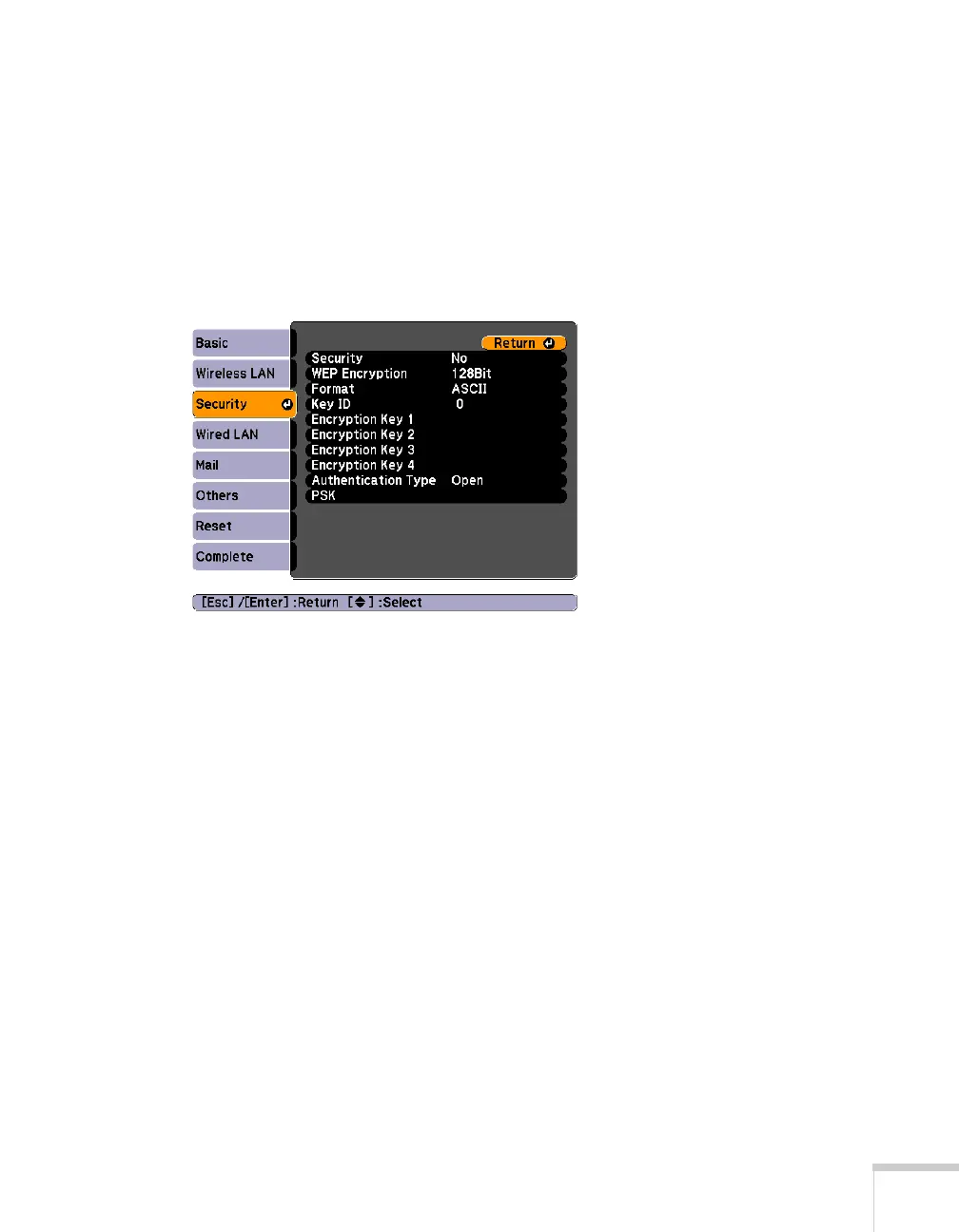 Enter to select Security, then select WEP and press Enter.