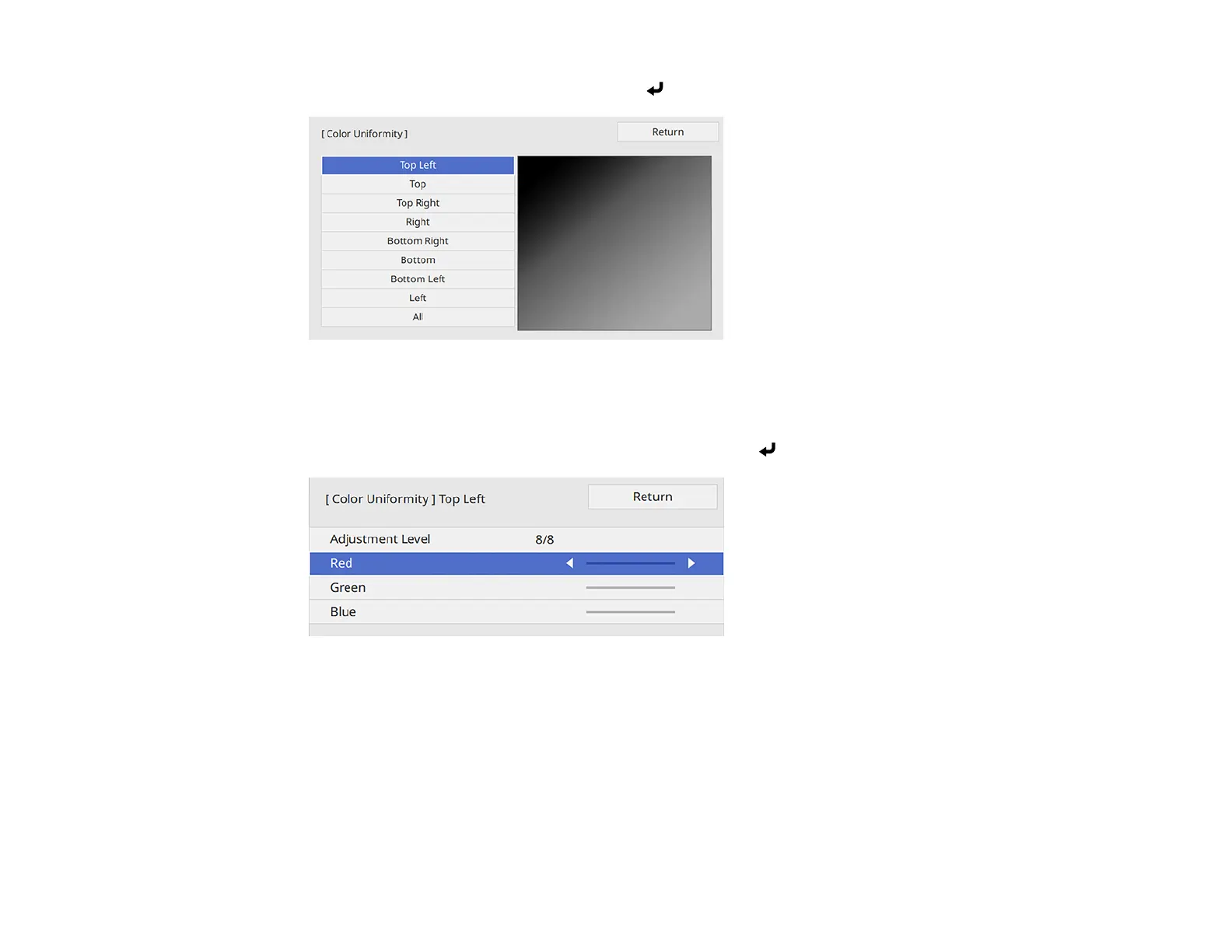 8. Select Red, Green, or Blue and press the left arrow button to weaken the color tone or the right