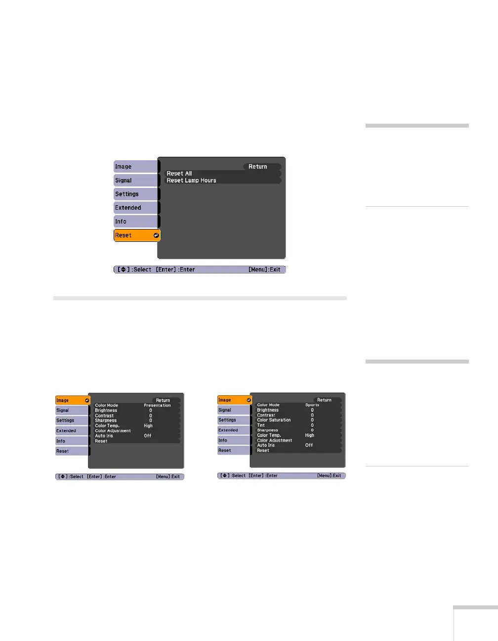 Reset menu, highlight Reset All, press Enter, and select