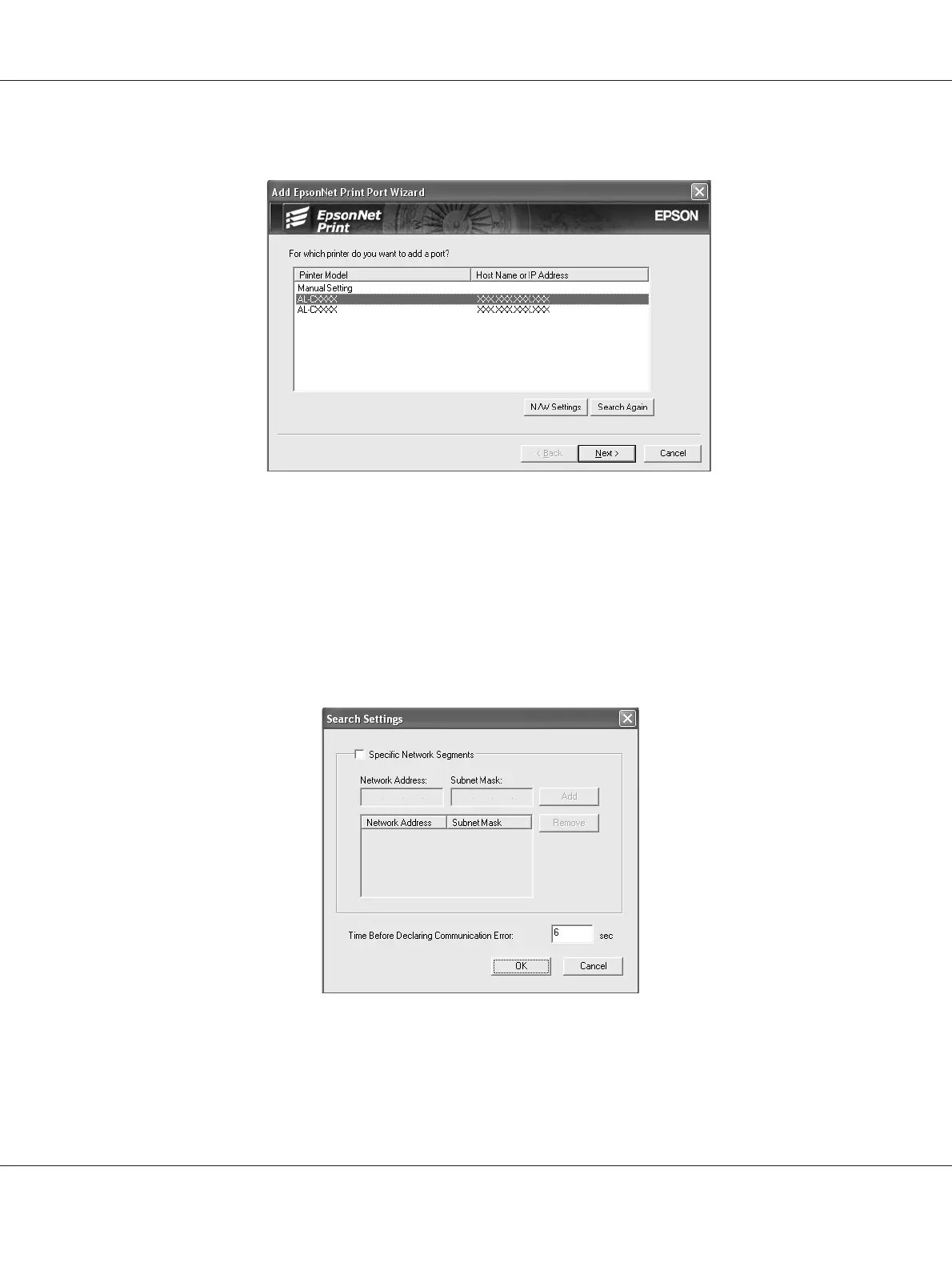 ❏ If you want to search printers in other segments, click the N/W Settings button. Select the