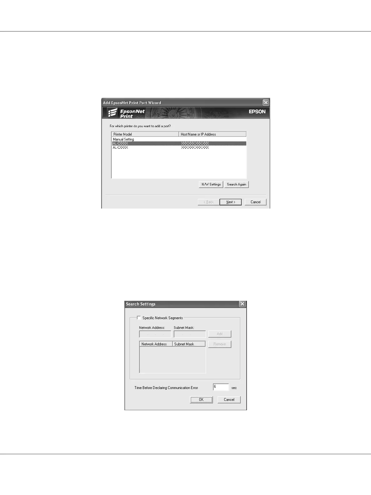 ❏ If you want to search printers in other segments, click the N/W Settings button. Select the