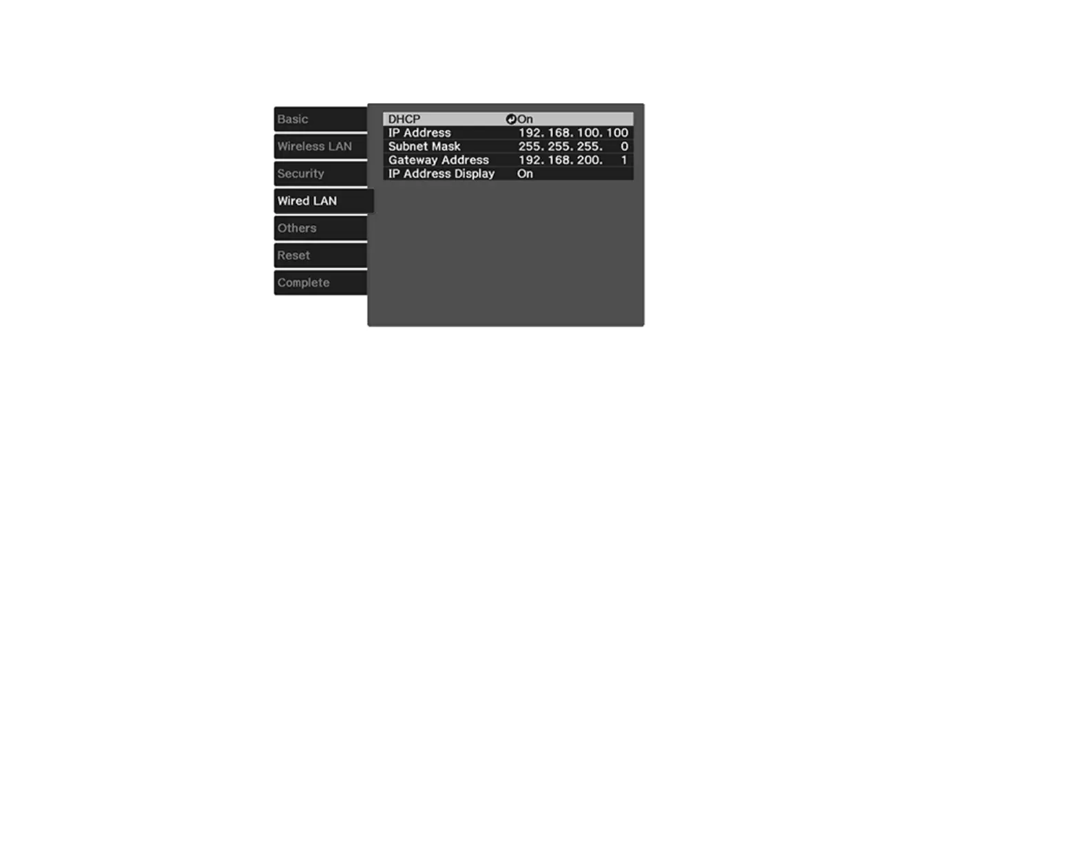 • If you must set addresses manually, turn off DHCP and enter the projector's IP Address, Subnet