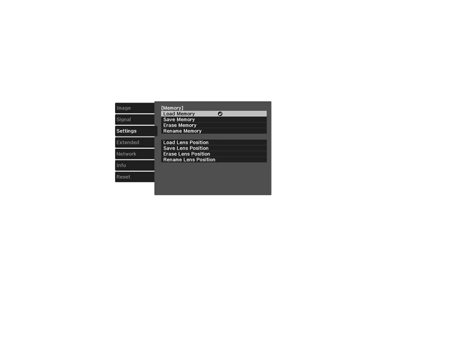 • Load Lens Position: Overwrites your current focus, zoom, and lens shift settings with saved