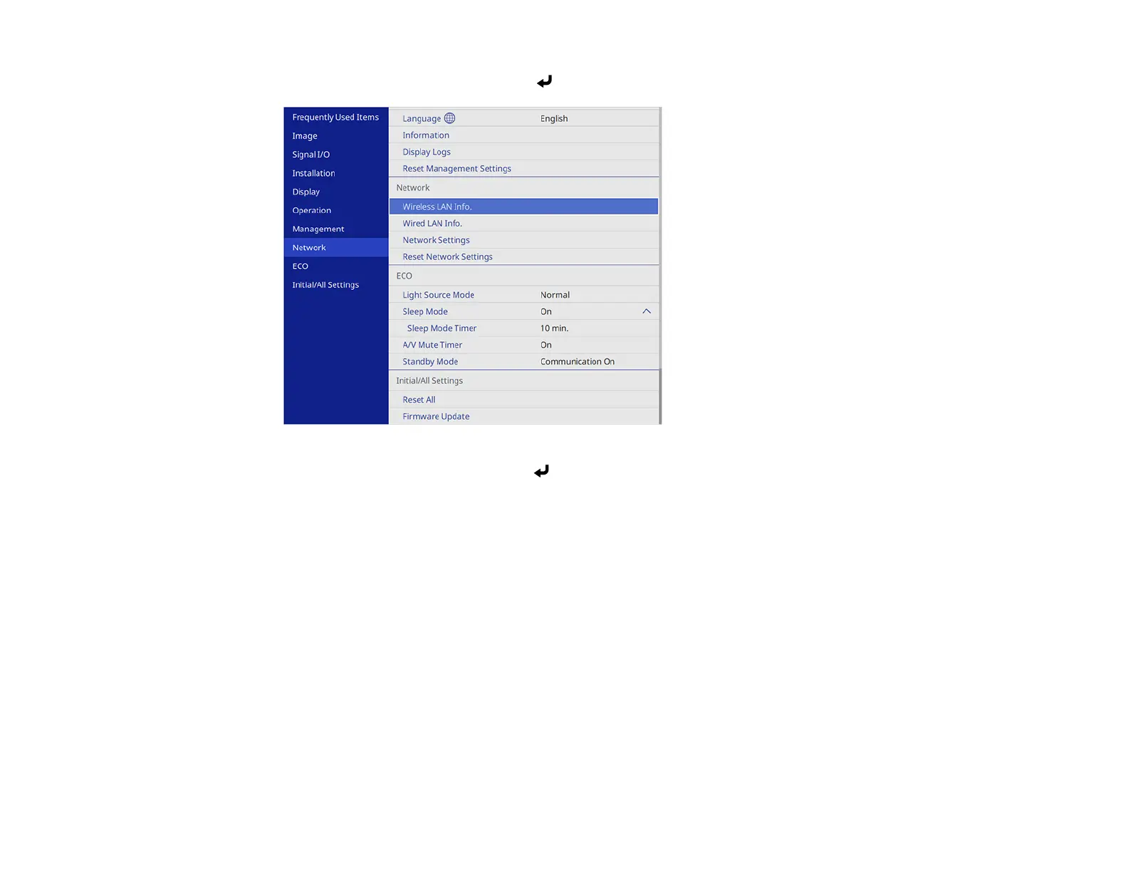 5. Select the Network menu and press Enter.