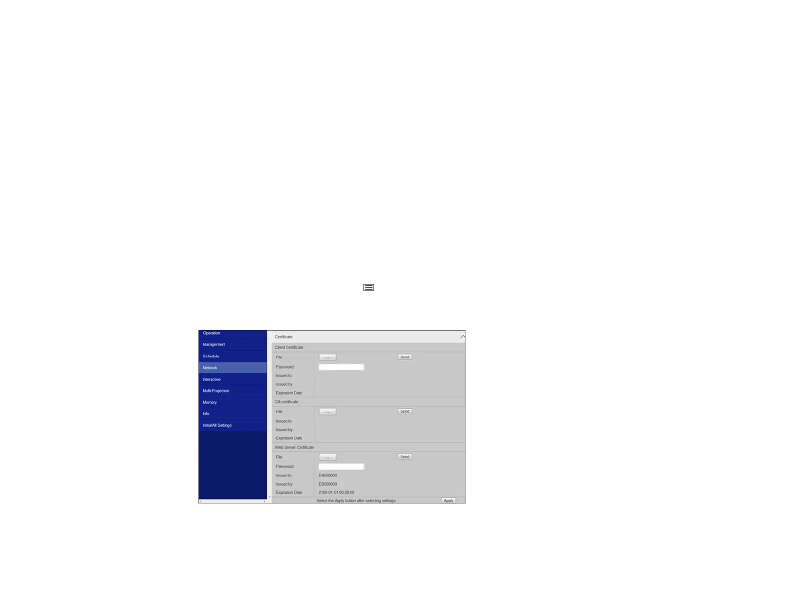 Note: You can also register the digital certificates in the projector's Network menu. However, be sure to