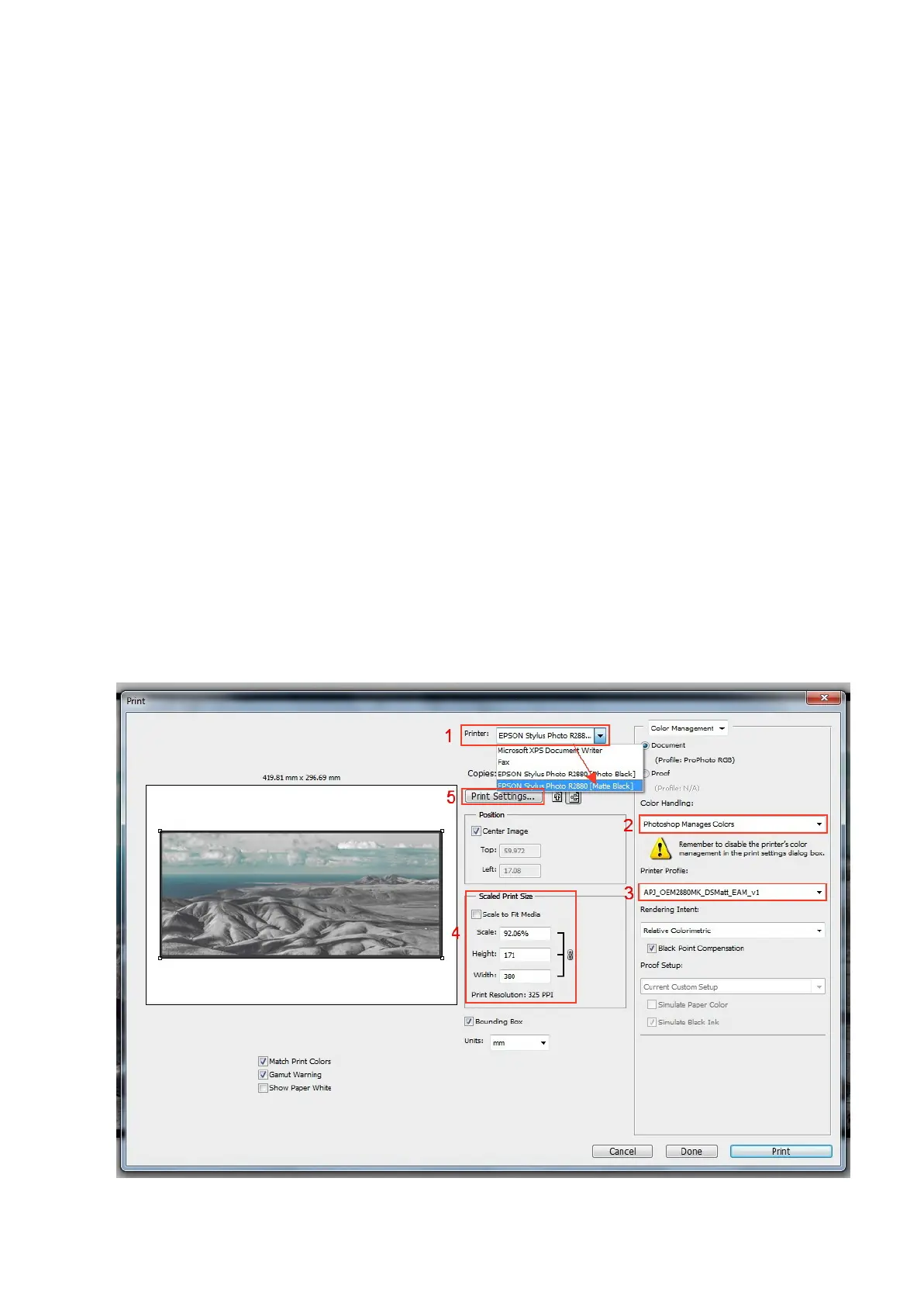 (1) Select the correct Printer for the paper type you’re using (“Epson Stylus Photo R2880 [Photo Black]”