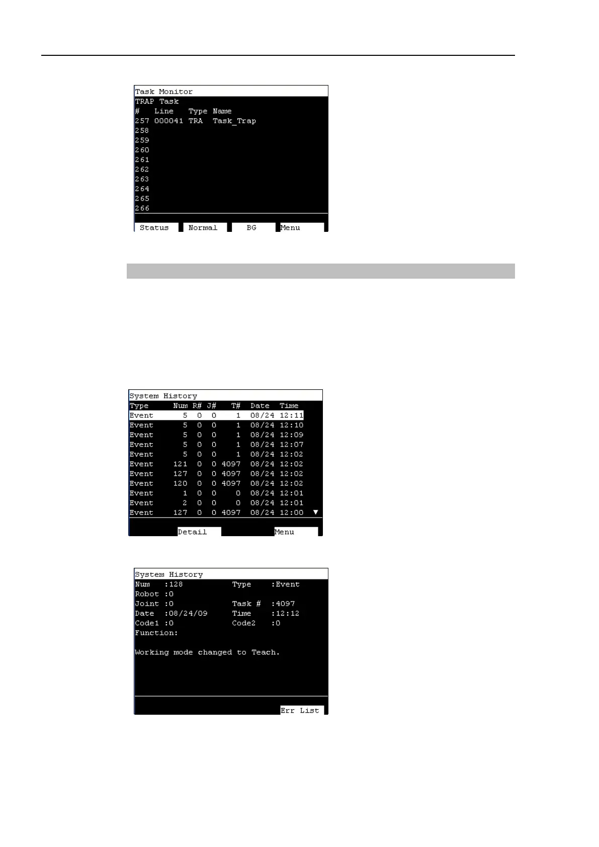 Displays the item type, Number, Robot#, Joint #, Task #, Date, and Time in this order