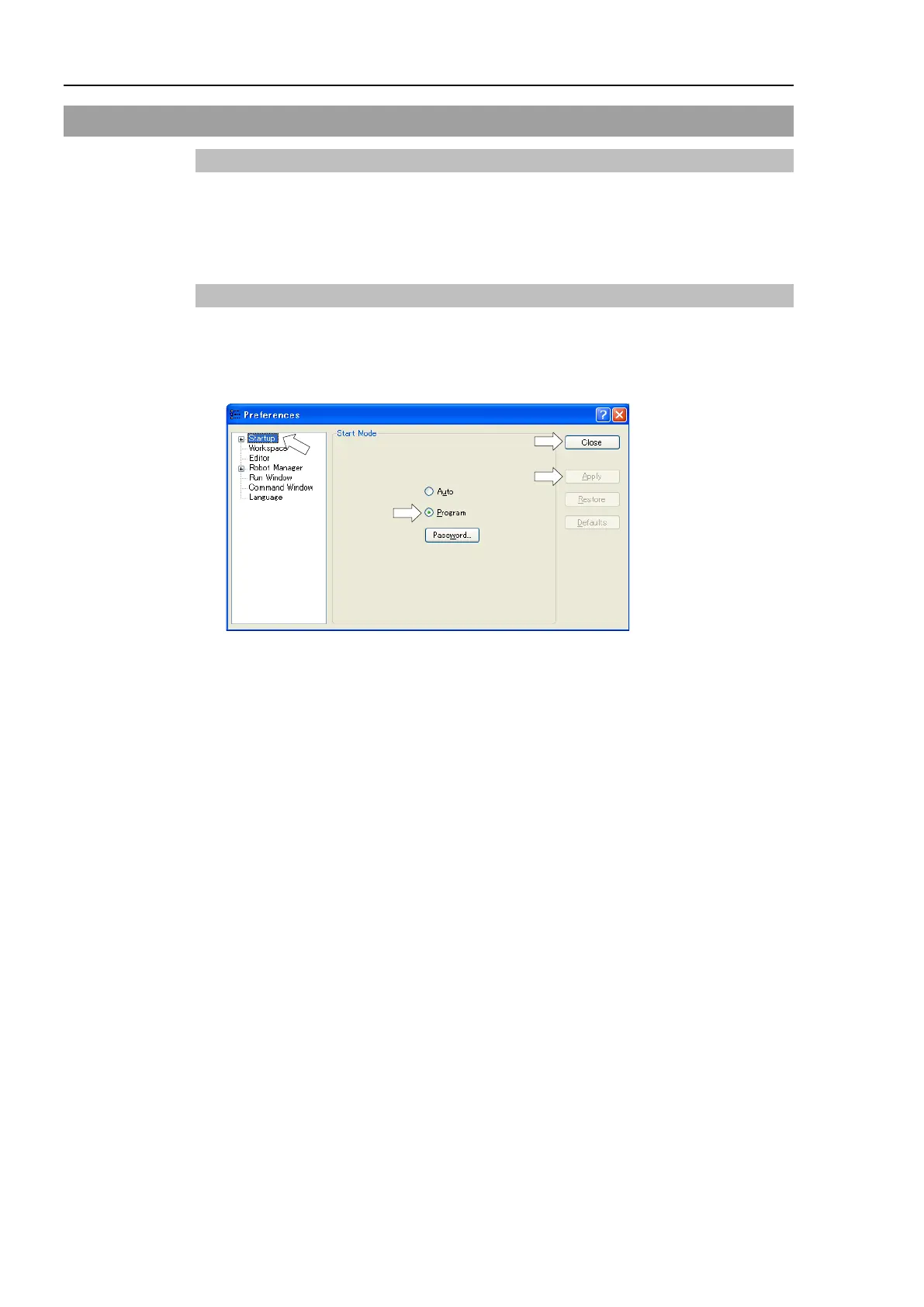 Set the start mode of the EPSON RC+ 6.0 to “Program” and start up the Controller.