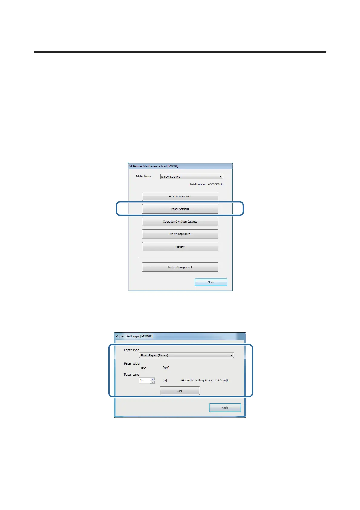 Set the Paper Type and the Paper Level, and then click Set.