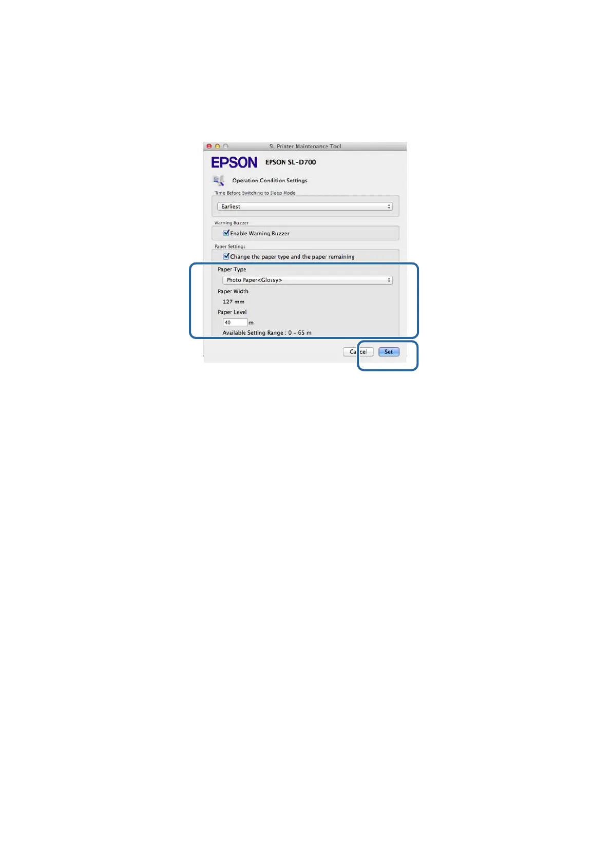 Set the Paper Type and the Paper Level, and then click Set.