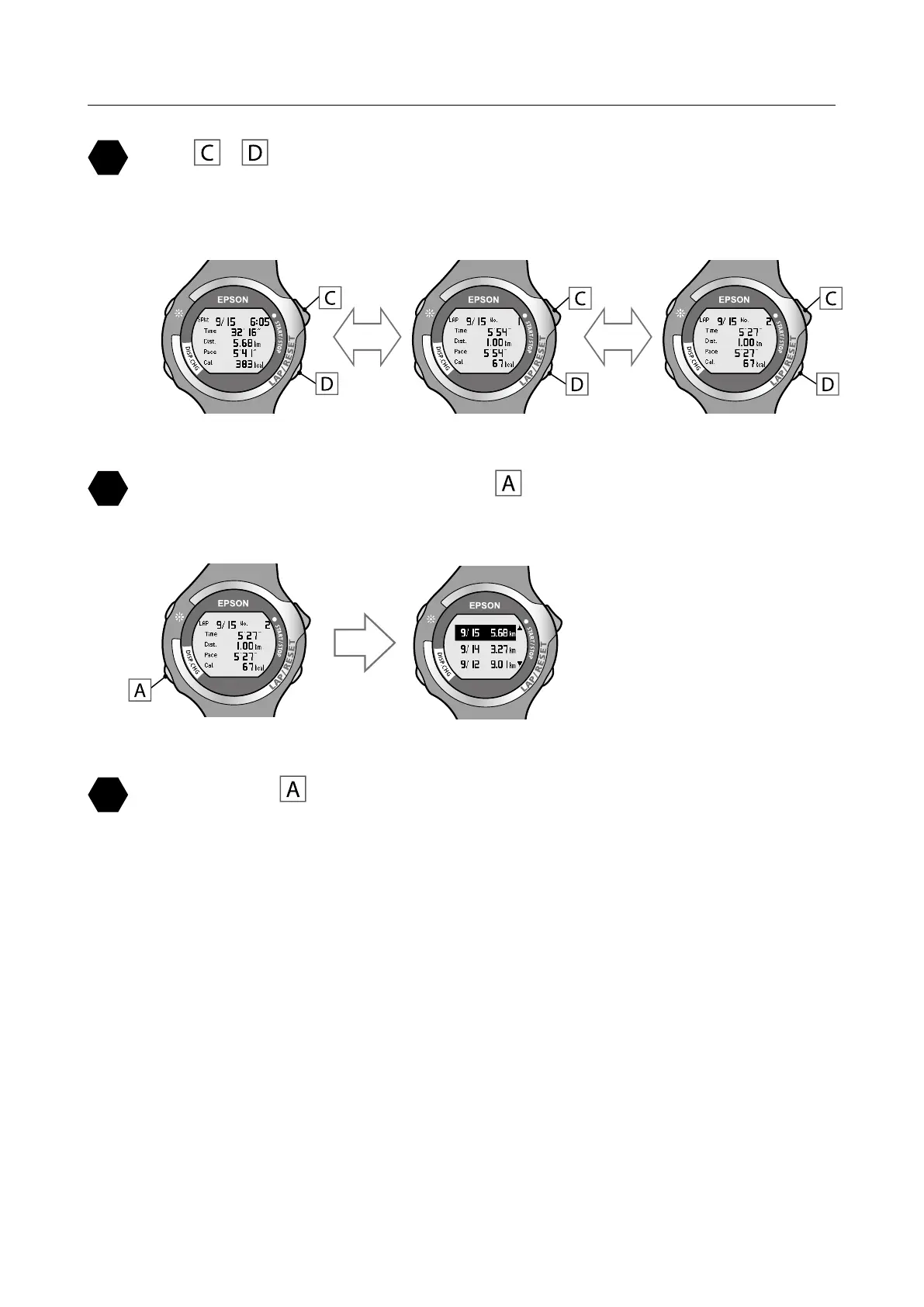 Screen 1 displays the split time, and screen 2 displays the lap time.