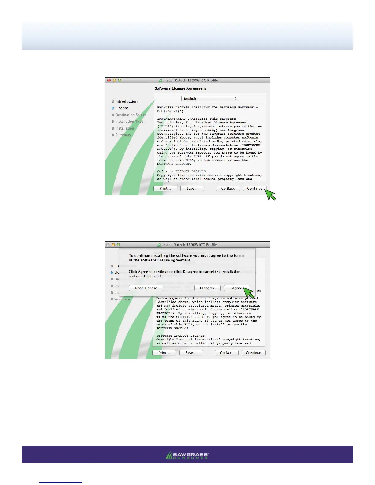 11.) In the License window, read the terms of the Software License Agreement and click Continue when