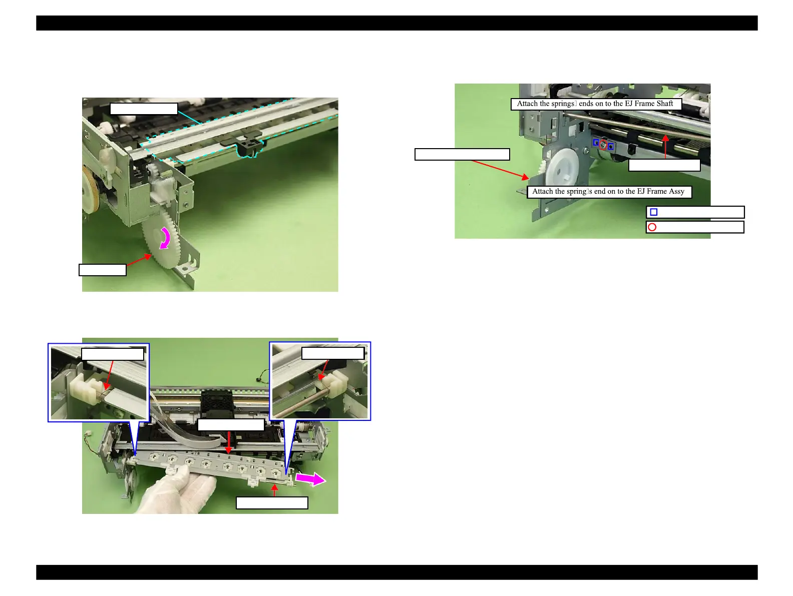 While holding the right side of the EJ Frame Assy, turn the Spur Gear on the