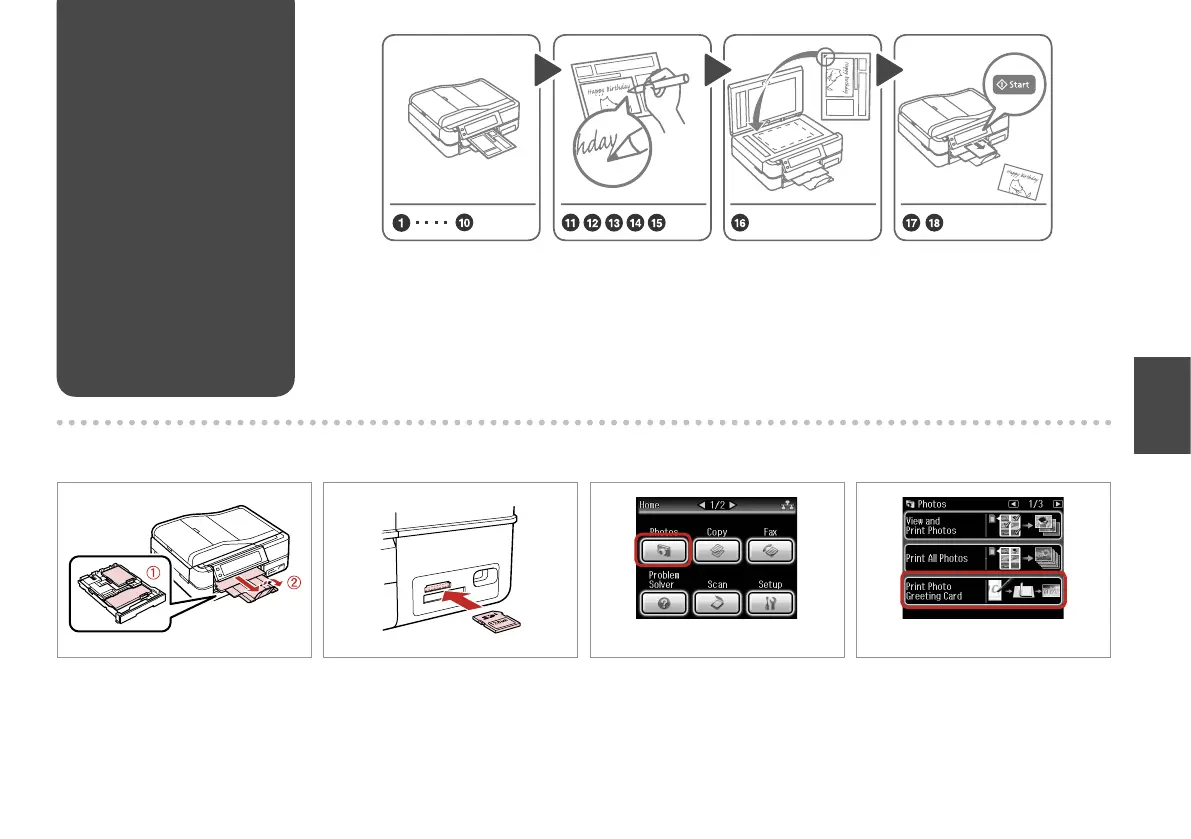 Load photo/A4 plain paper. Insert a memory card. Select Photos. Select Print Photo Greeting Card.