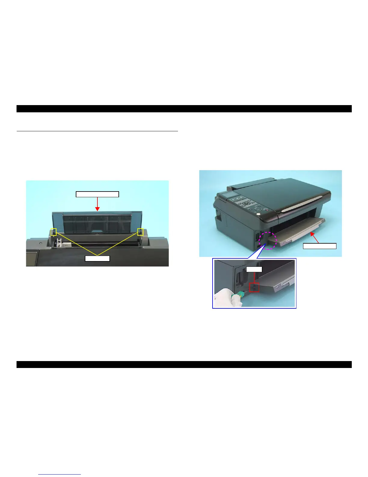 1. Release the guide pins (x2) that secure the Paper Support Assy and remove it