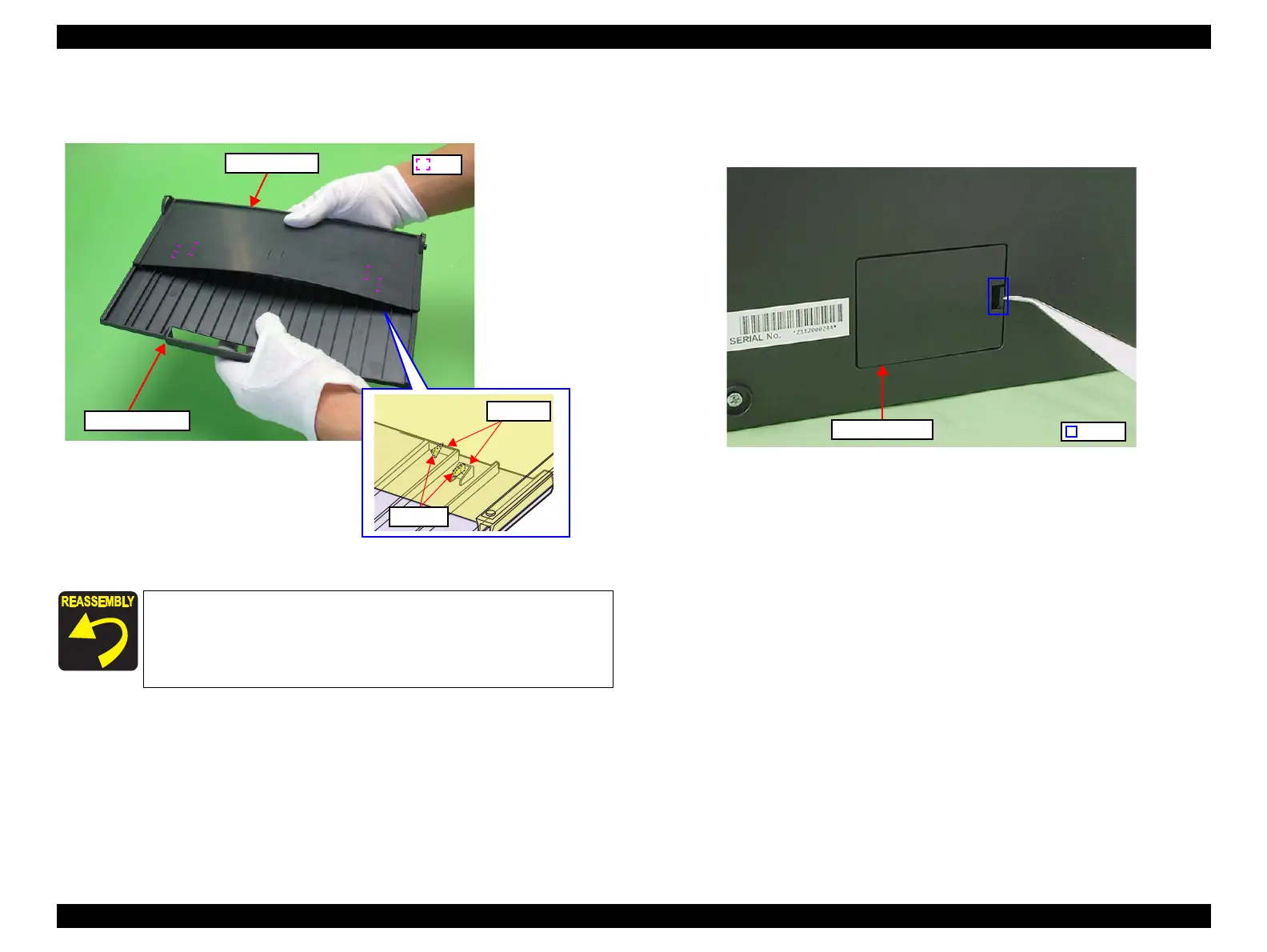 3. Bend the Stacker Assy to release the ribs, then separate the Tray Exit Outer