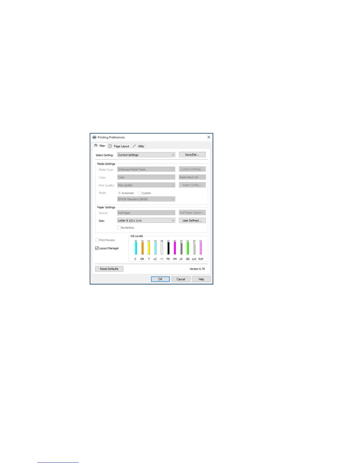 3. Select Layout Manager on the Main tab and choose an option for the Size setting that matches the