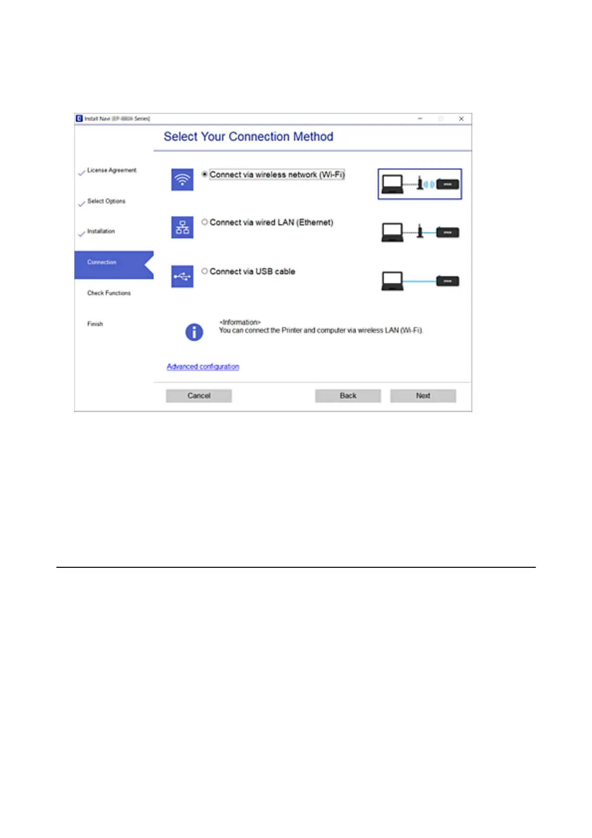 If Install Soware is displayed, select Set up Printer connection again (for new network router or changing USB to
