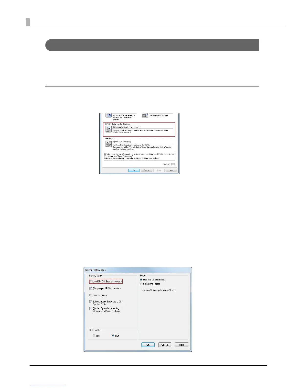[Not use EPSON Status Monitor 3] is set by default setting. [Notification Settings for Fatal Errors] is
