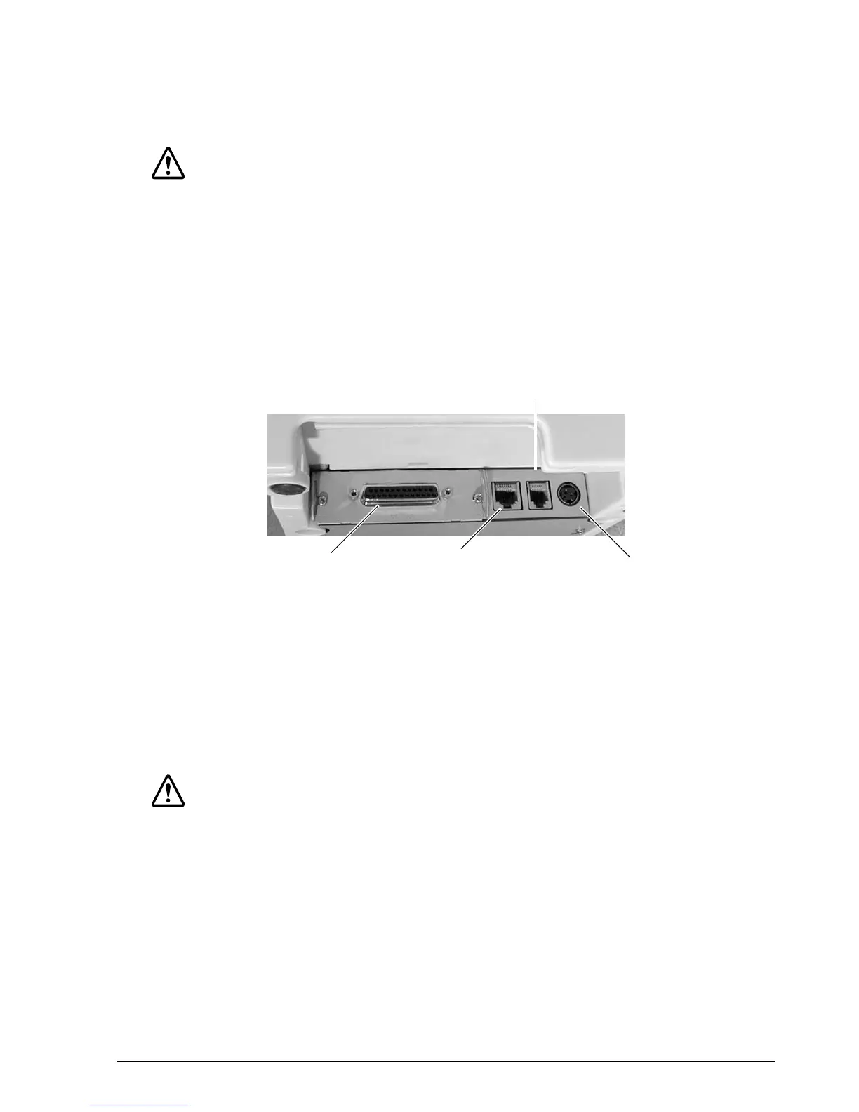 Never connect a telephone line to the drawer kick out connector (labeled “DK”).