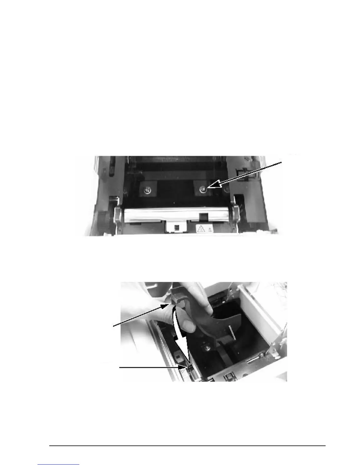 Open the roll paper cover and remove the screw on the right end. Do not discard the screw, as it